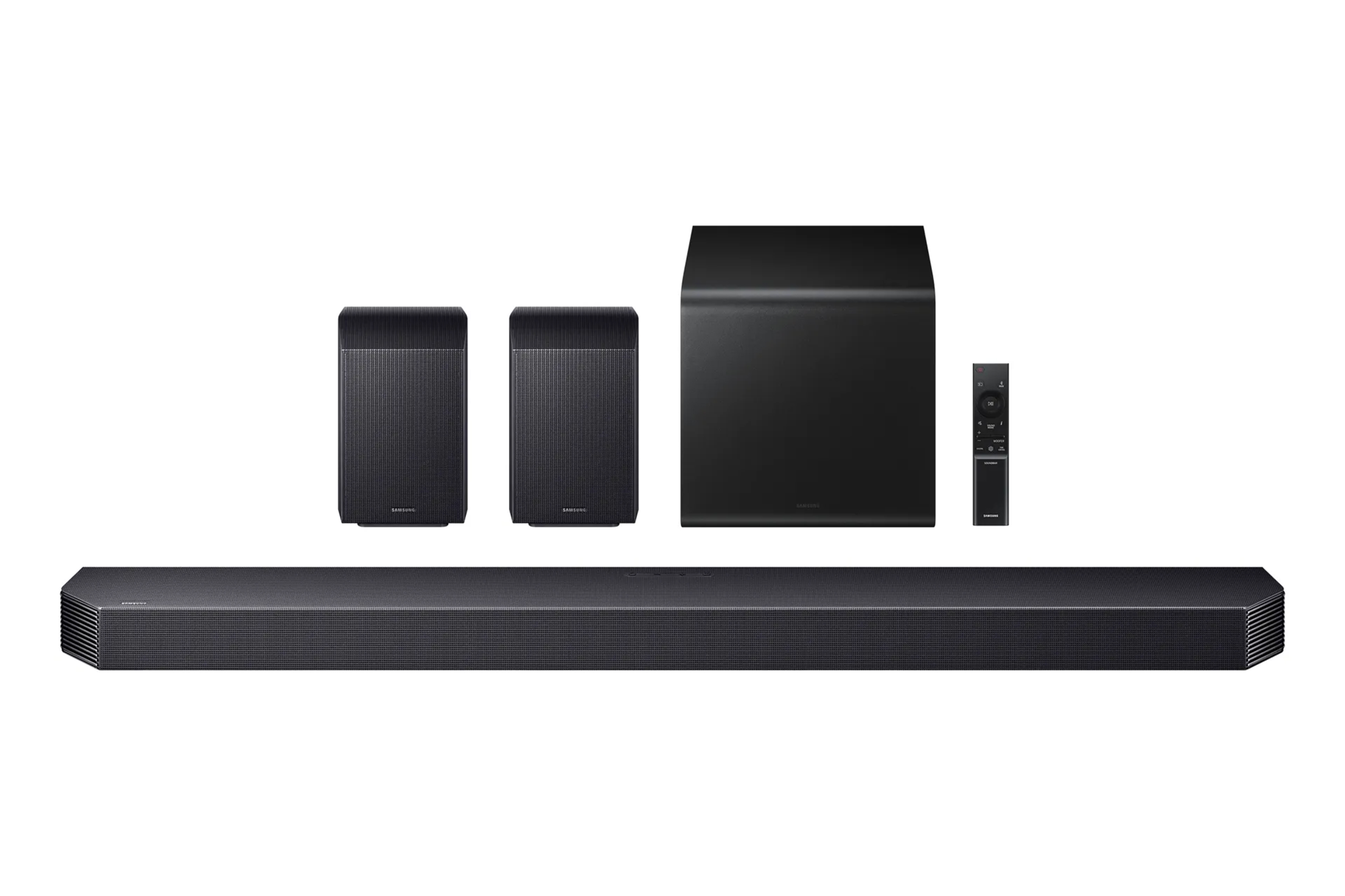 In onze test gebruiken we de Samsung HW-Q930F soundbar set in combinatie met de OLED S95F televisie die we eerder op de proef namen (Totaal TV nummer 7). De Q930-serie heeft niet zulke indrukwekkende specificaties als de zeer pittig geprijsde Q990-lijn van Samsung, maar heeft wel veel van dezelfde functies voor een vriendelijkere prijs rond de 500 euro. De set bestaat naast de 111 cm brede soundbar uit twee achterspeakers, een subwoofer en een afstandsbediening. Gezamenlijk vormen de zeventien drivers in de luidprekers een 9.1.4-systeem, dus met negen surroundkanalen, één subwooferkanaal voor de lage tonen en vier hoogtekanalen. Voor de hoogtekanalen zijn zowel de soundbar als achterspeakers voorzien van opwaarts gerichte drivers die het geluid via het plafond naar de luisteraar kaatsen. Dit komt vooral van pas bij het luisteren naar geluid in Dolby Atmos.